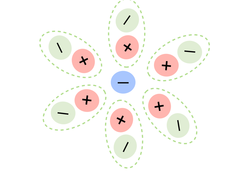 è la celebre costante di Planck. Qual è la conseguenza di questi effetti quantistici? È molto complicato da descrivere a parole, dato che si tratta di calcoli puramente matematici. Un modo per interpretare ciò che succede è quello di immaginare che mediamente l’elettrone originale attiri verso di sé i positroni virtuali (elettroni di carica opposta), ed allontani gli elettroni virtuali (di carica uguale). L’effetto è che la carica elettrica dell’elettrone originale è ora distribuita in un volume di spazio che è maggiore di quello supposto all’inizio, limitato al raggio